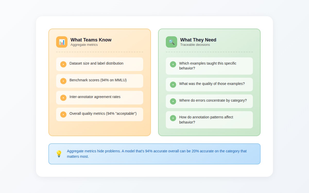 Aggregate label quality was still 94%, well within accepted range. But concentrated error in this category broke a critical use case. Without visibility into which examples taught the model about wheelchairs, they spent three weeks debugging architecture instead of data.