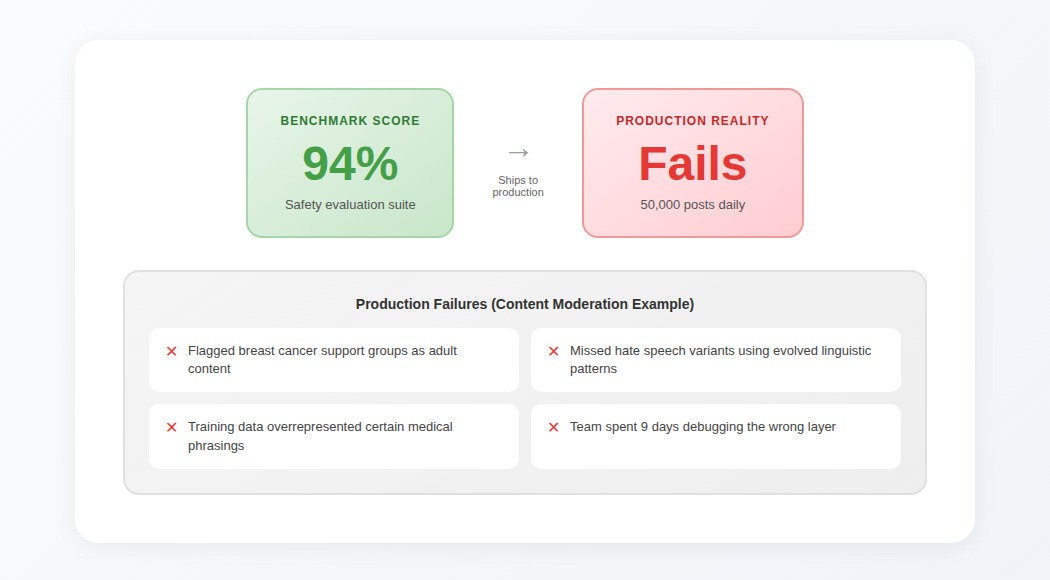 I’ve seen a content moderation model score 94% on standard safety benchmarks. Comprehensive evaluation suite, thousands of test cases, industry-standard metrics. It shipped to production handling 50,000 posts daily.