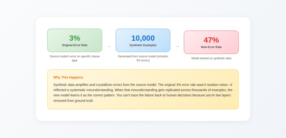 The original model had a 3% error rate on that clause type. After training on 10,000 synthetic examples including those errors, the new model's error rate jumped to 47%. Synthetic data amplified and crystallized the original confusion.