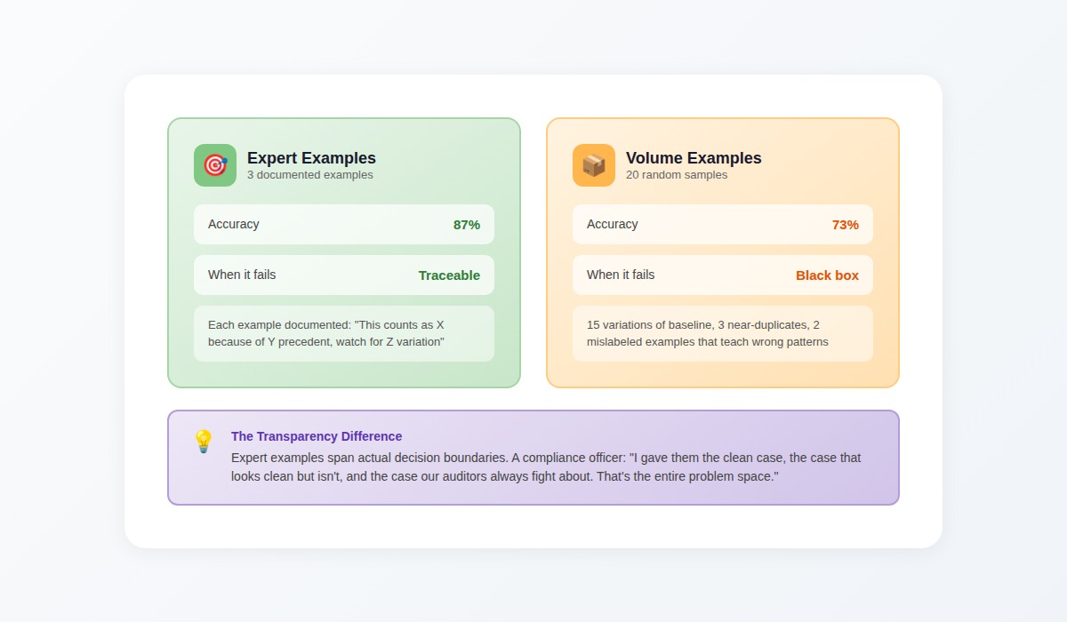 But here's what matters for transparency: when the expert-trained model fails, we can trace why. When the volume-trained model fails, we face statistical noise with no path back to human decisions.