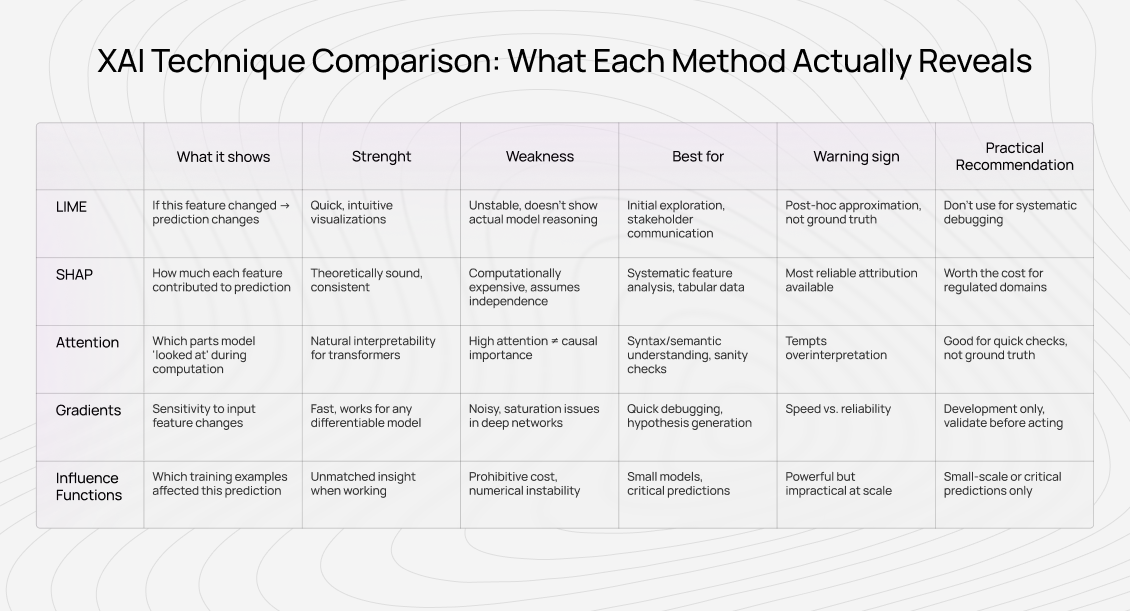 The explainability field has converged on several core approaches, each with distinct strengths and failure modes. Let’s understand what these techniques actually measure, versus what they claim to explain.