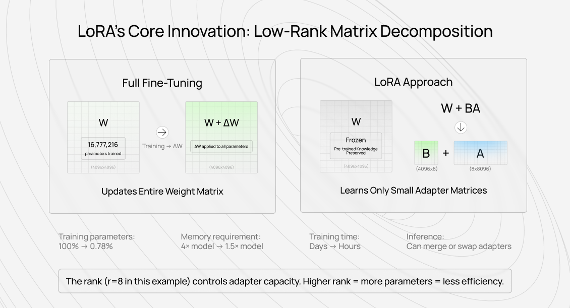 LoRA is a parameter-efficient fine-tuning technique that trains small adapter matrices instead of updating all model weights. Rather than modifying billions of parameters during fine-tuning, LoRA freezes the pre-trained model and learns low-rank decomposition matrices that capture task-specific adaptations.