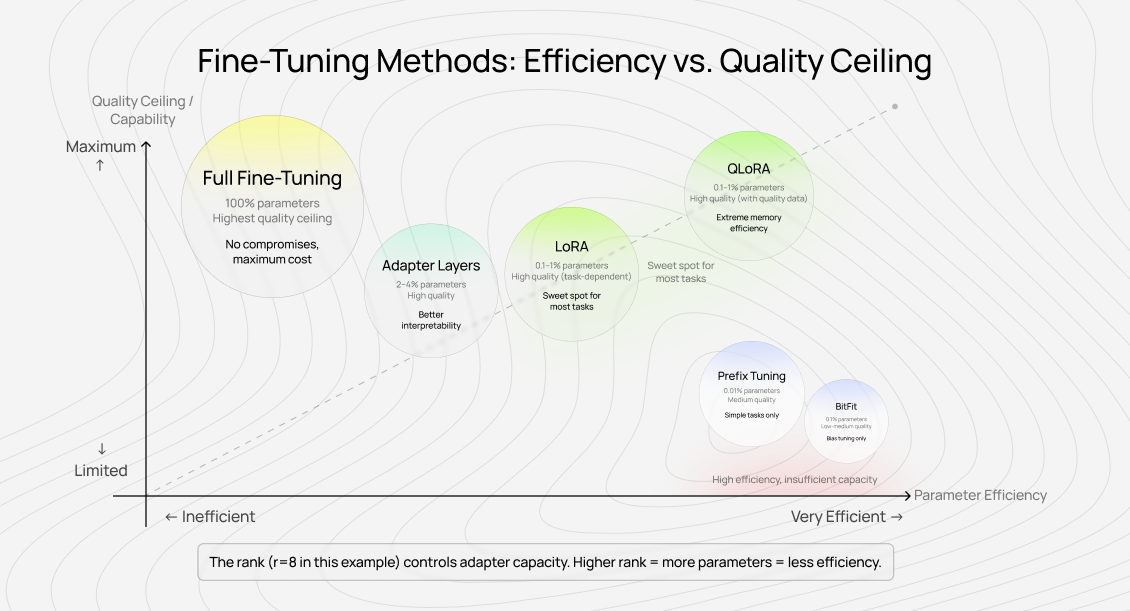 LoRA sits in a crowded space of parameter-efficient fine-tuning methods. Understanding the tradeoffs matters more than following trends.