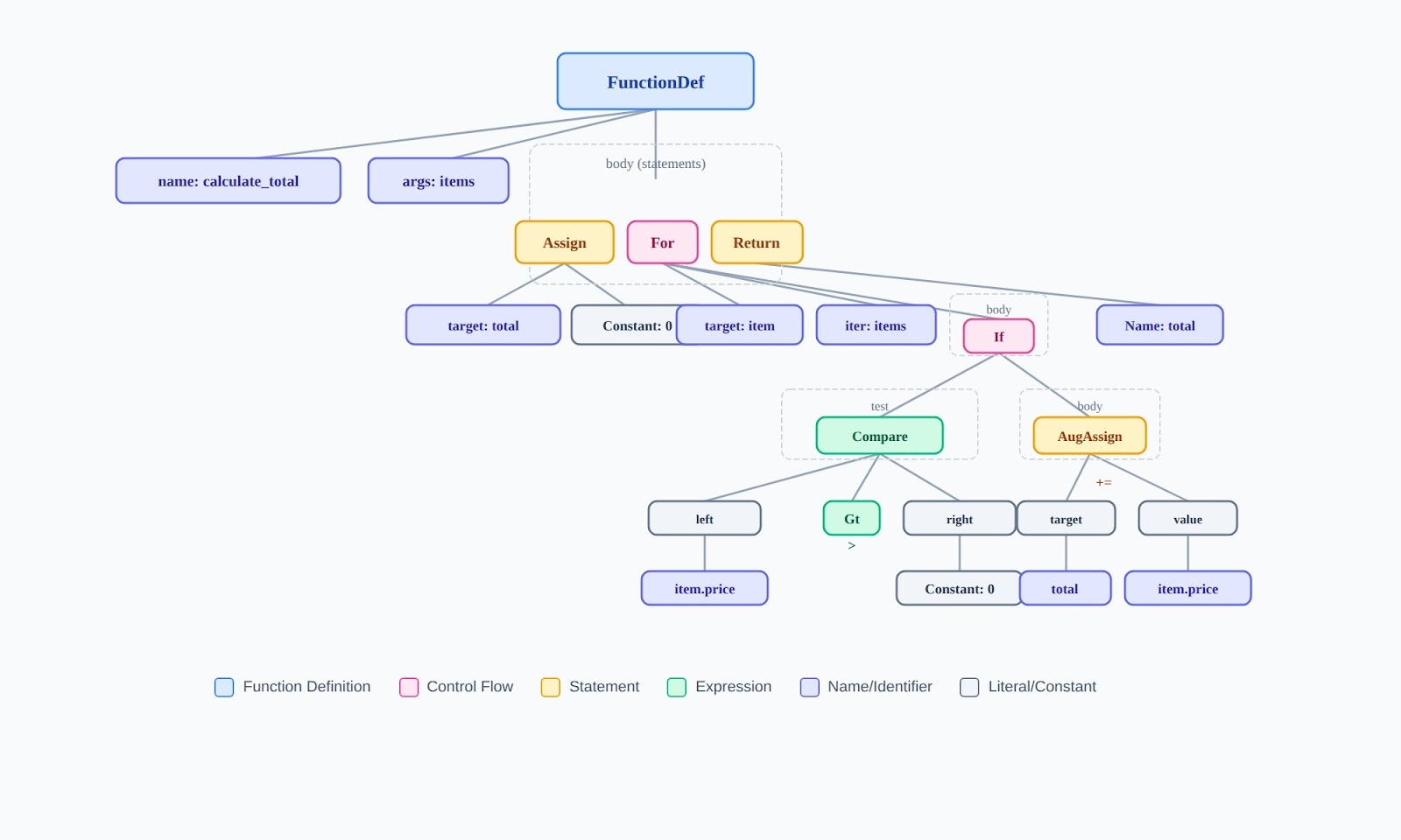 Every programming language parses source code into an abstract syntax tree (AST) before compilation or execution. The tree represents the hierarchical structure of the code: a function contains statements, statements contain expressions, expressions contain operators and operands.