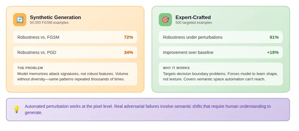 One of the annotators we work with created adversarial examples for diagnostic models. She thinks about scan artifacts, positioning variations, anatomical edge cases, and how radiologists reason about ambiguous findings. We added 200 of her examples to a training set of 50,000 standard images plus 20,000 synthetic adversarial examples. Model performance on held-out clinical evaluation improved by 16%.
