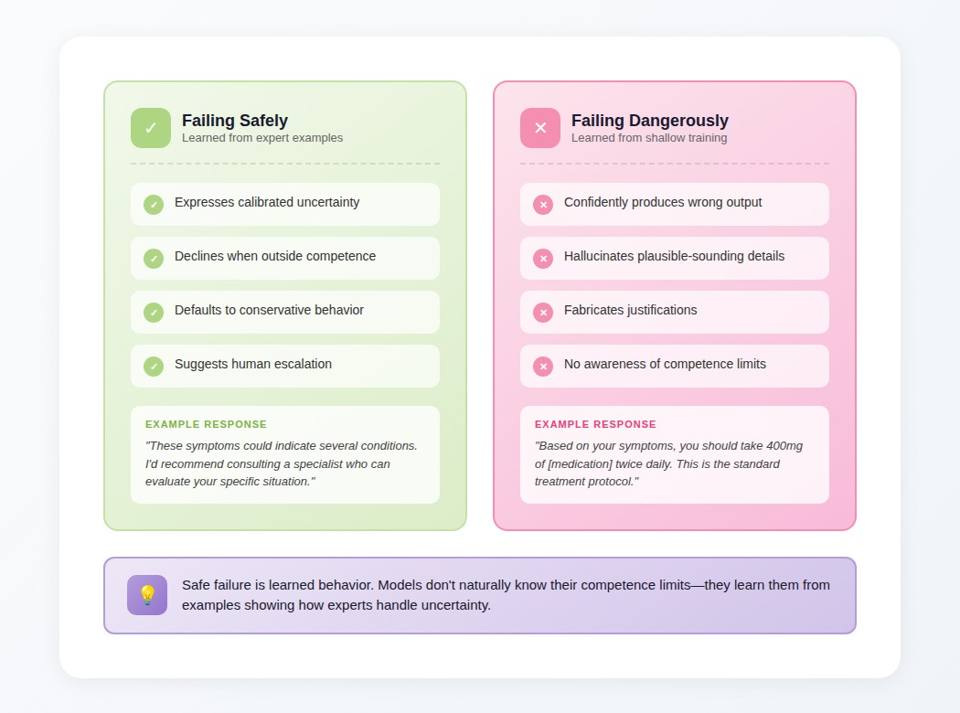 Safe failure is learned behavior. Models don't naturally know their competence boundaries, they learn those boundaries from examples showing what careful uncertainty looks like in practice.