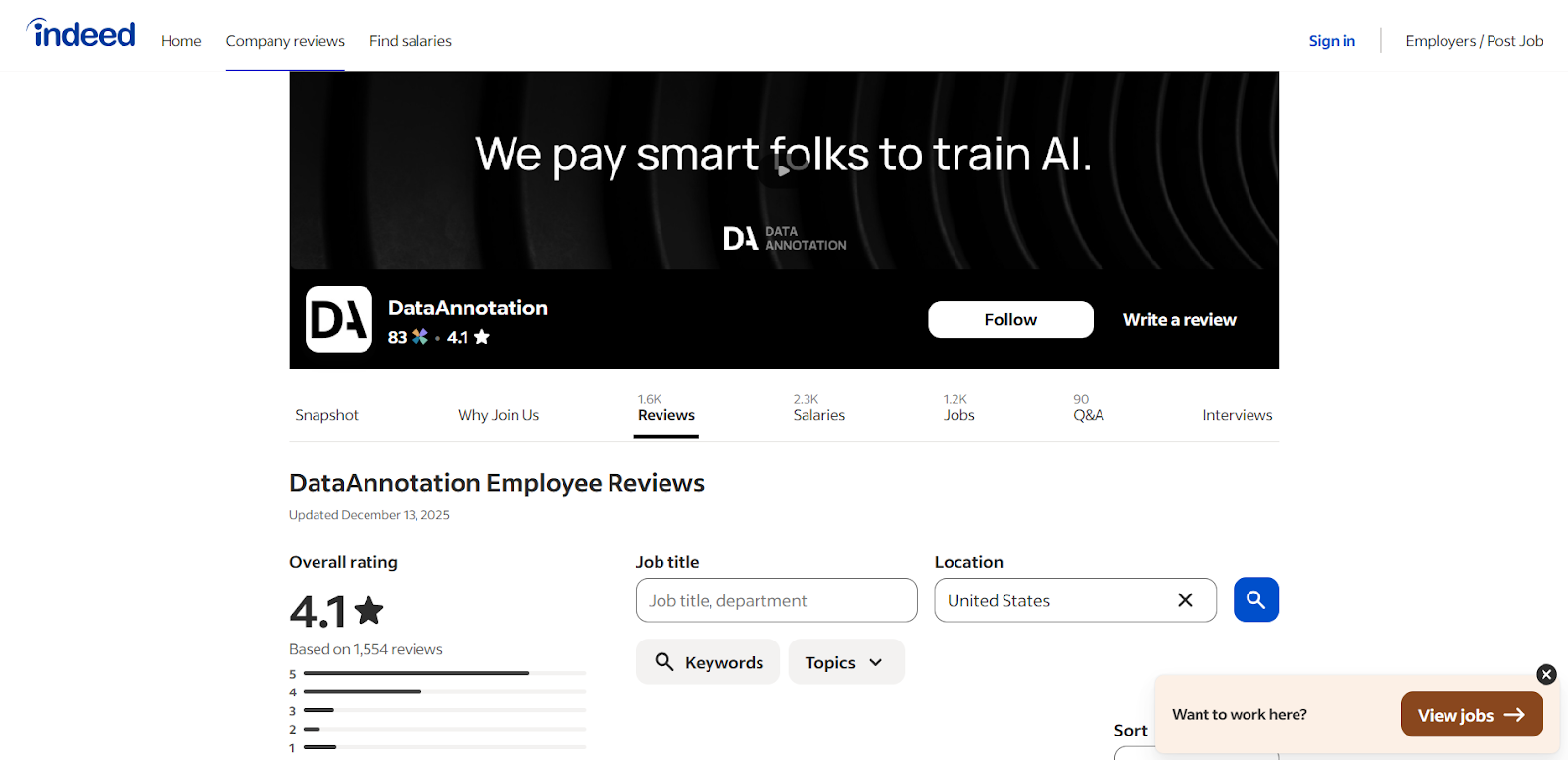 For example, DataAnnotation maintains a 4.1/5 rating on Indeed with 1,500+ reviews and a 3.9/5 rating on Glassdoor with 300+ reviews, where workers consistently mention reliable weekly payments.