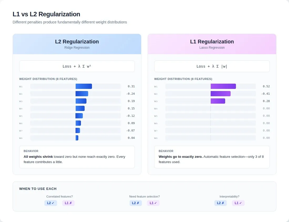 L2 says: "Everything might matter a little." L1 says: "Find what actually matters and ignore the rest." That's not a tuning decision. It's a belief about your data.