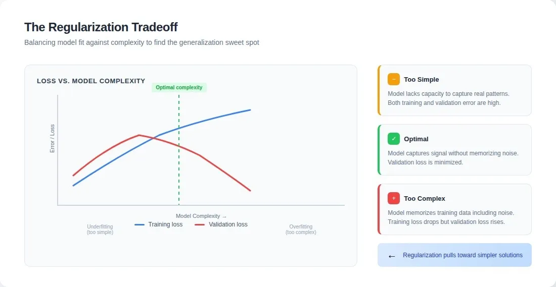 Regularization is a set of techniques that penalize model complexity during training. It adds a cost not for wrong answers, but for elaborate ones. L1 and L2 weight penalties, dropout, early stopping, and data augmentation all work differently but share a common premise: a model that needs complicated machinery to fit the training data probably learned noise along with the signal.