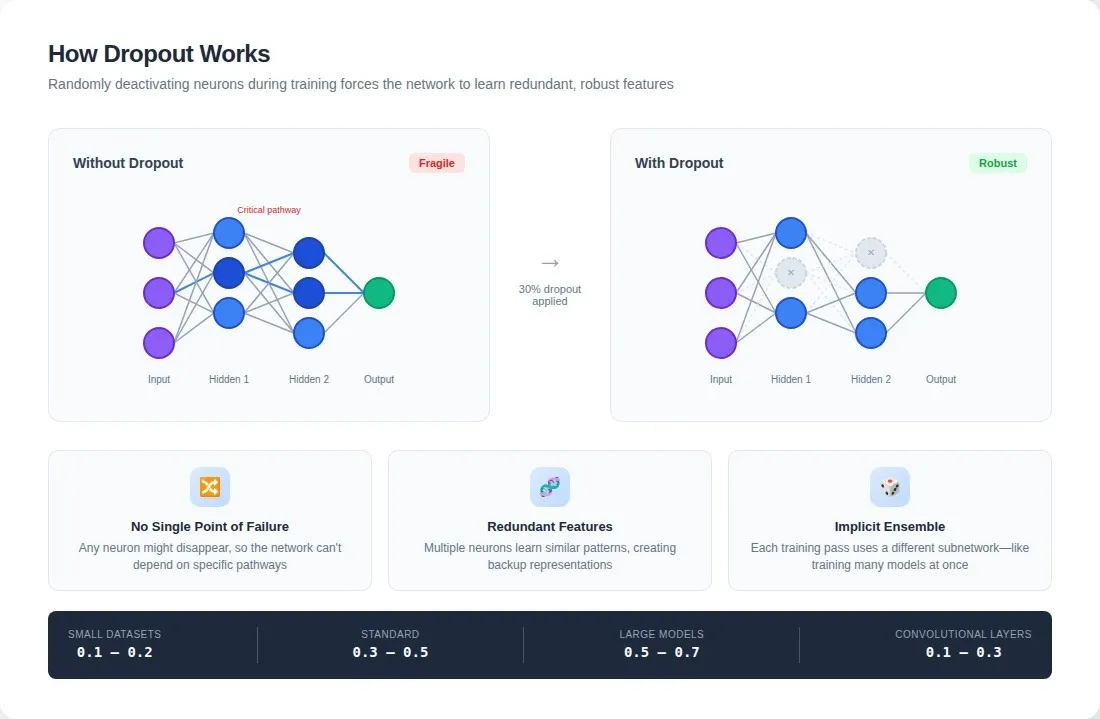 The insight: dropout prevents any single neuron from becoming critical. A neuron might disappear at any moment, so the network can't build dependencies on specific feature detectors. It must learn representations that are both redundant and robust.