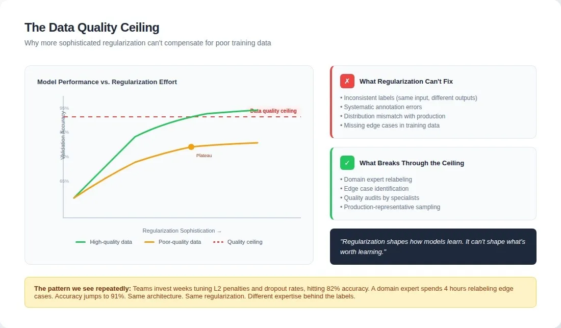 The missing insight: regularization sophistication and data quality requirements scale together, not independently. The more sophisticated your regularization becomes, the more it exposes the quality ceiling of your training examples.