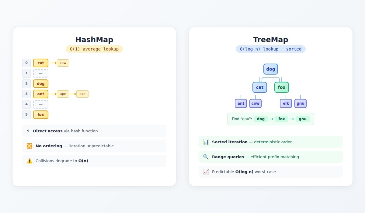 - TreeMap: Balanced binary tree. O(log n) lookup. Sorted iteration order. Efficient range queries. Predictable worst-case performance. Higher memory overhead per entry due to tree node structure.