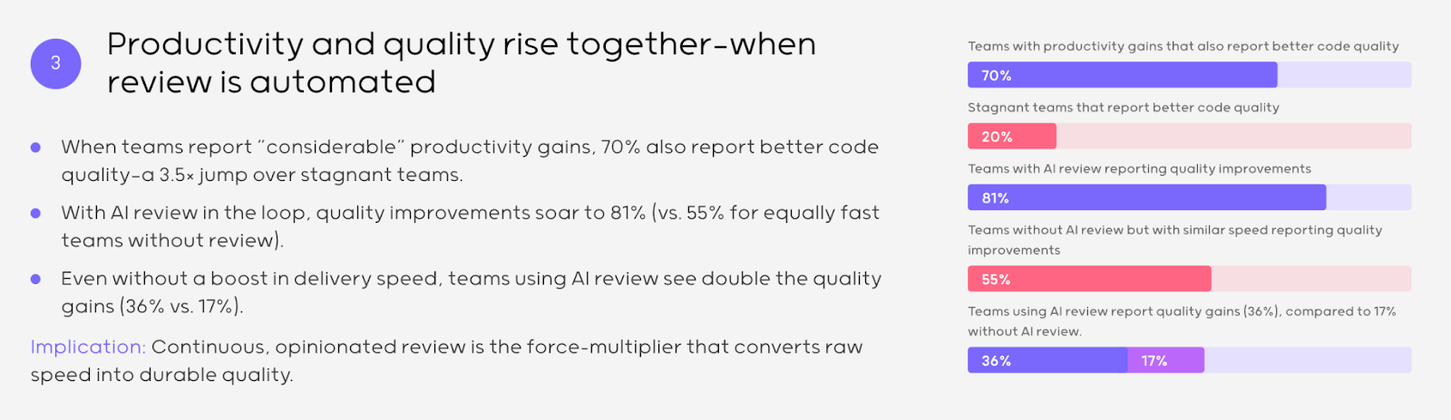 The data shows this can work. When teams report considerable productivity gains from AI tools, 70% also report better code quality. Teams using AI report quality improvements of 81%, compared to 55% for teams that are equally fast but without automated review. Even without increased delivery speed, AI review doubles quality gains. Teams using AI review see 36% quality improvements compared to 17% for teams moving at the same pace without it.