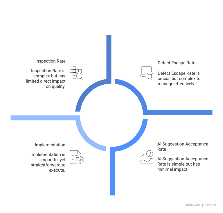 - Implementation: Establish baselines before changing your process. Run two weeks of measurement with your current workflow. Deploy AI review to a subset of repositories first and compare defect escape rates. Review metrics monthly; if they're not improving, tune your configuration rather than waiting longer.