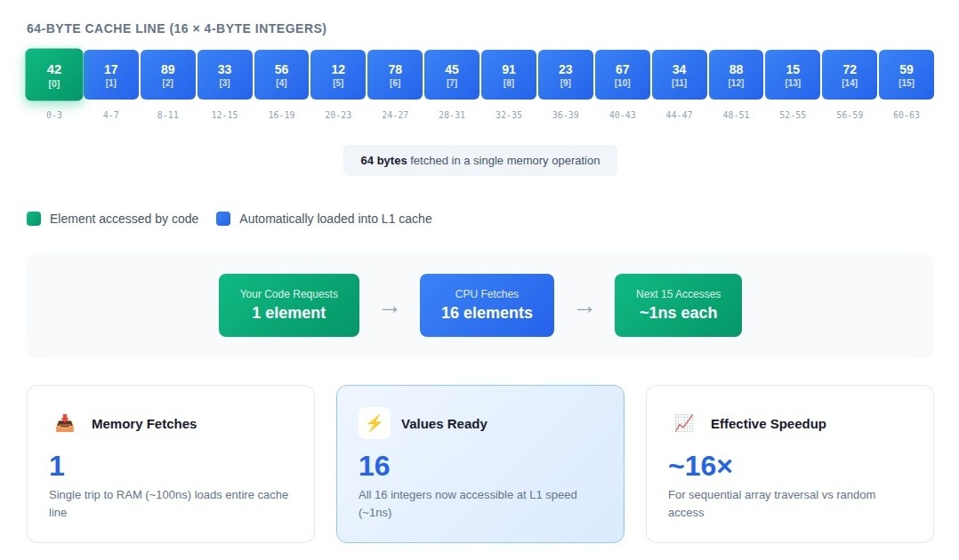 That bet pays off spectacularly with arrays. Processing 4-byte integers means a single cache line holds 16 consecutive values. Touch the first element, and the next 15 accesses hit L1 cache at sub-nanosecond latency instead of the 100+ nanosecond round-trip to main memory.