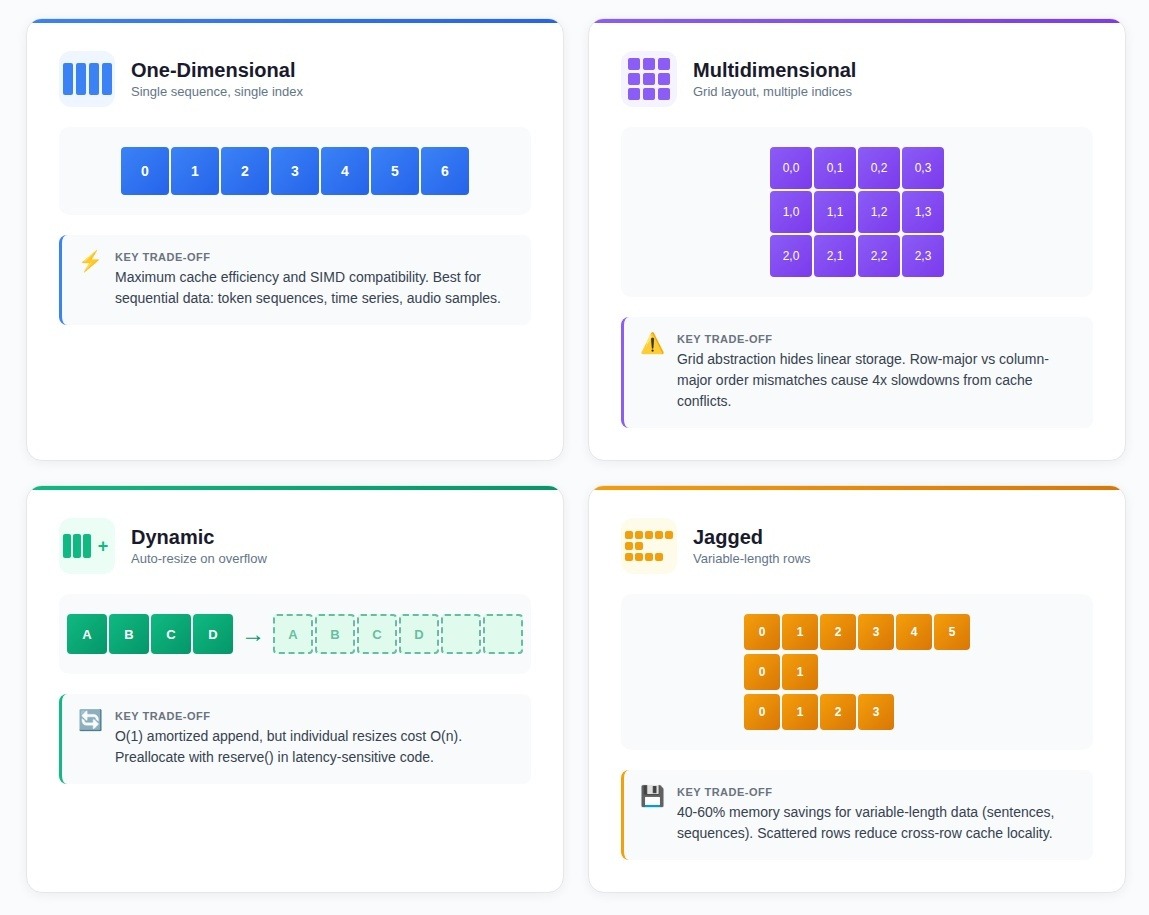 Most production arrays are one-dimensional: token sequences in language models, time series data, audio samples. The simplicity enables cache efficiency and vectorization that more complex structures sacrifice.