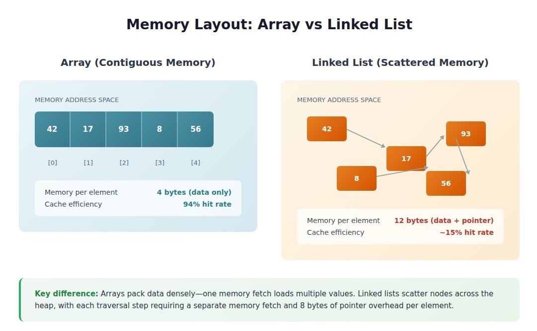 A linked list we profiled took 8.2 seconds to process 10 million records. The equivalent dense array: 1.4 seconds. Same algorithm, same data volume. The linked list scattered nodes across the heap; each traversal step missed the cache and fetched from main memory. The array version hit L1 cache 94% of the time after the initial load.