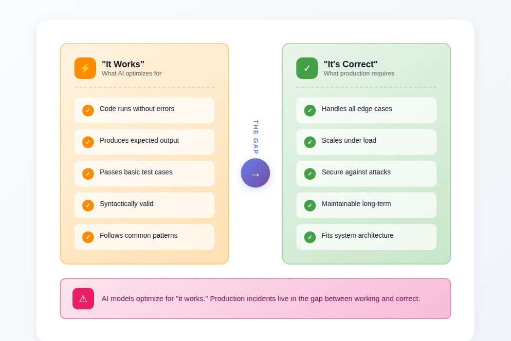 "It runs" and "it's correct" are different standards, and models optimize for the former without understanding the latter. When generated code executes on the first try, the natural assumption is that it works. The problems emerge later: in edge cases nobody tested, under load nobody simulated, during security reviews months after deployment.