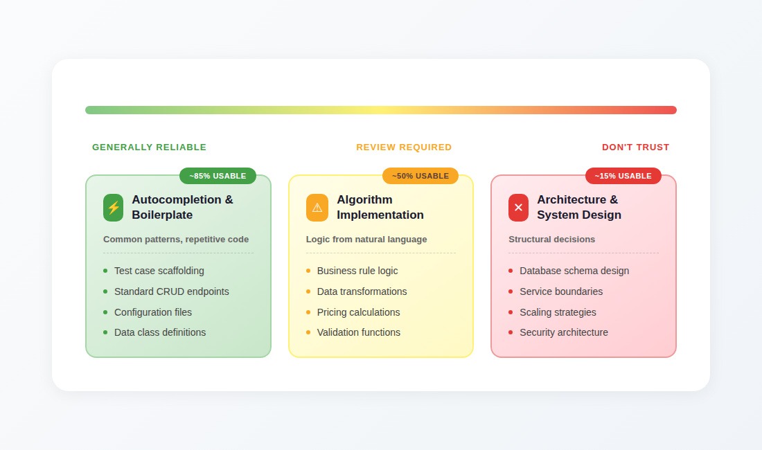 Not all code generation is equally reliable. The same model that writes perfect boilerplate will confidently produce architectural decisions that become six-month cleanup projects.