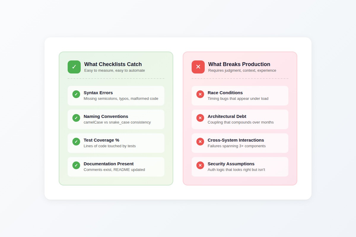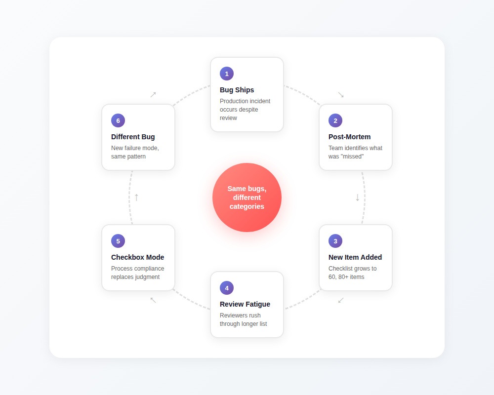 The checklist even included an item about that exact bug category. Someone checked it off. The reviewer scanned for the obvious patterns that category implies and found nothing obviously wrong. What the checklist couldn't capture was the actual failure mode — which required understanding how three different systems interacted under load, not whether a specific code pattern was present.