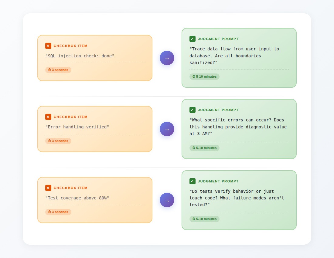The difference between "error handling verified" and "what happens when this breaks at 3 AM" is the difference between checking a box and doing a review. The first takes three seconds, but the second requires understanding what this code actually does.