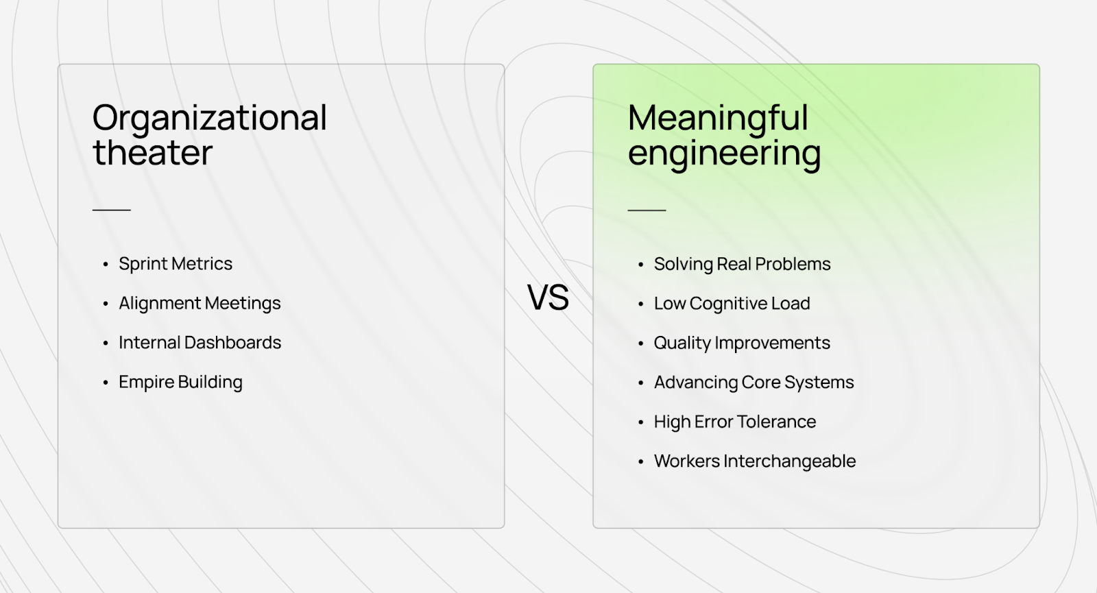 The same thing happens in engineering organizations. Story points increase, velocity improves, and sprint commitments are met. But developers look at their work and think: "I haven't built anything meaningful in six months."