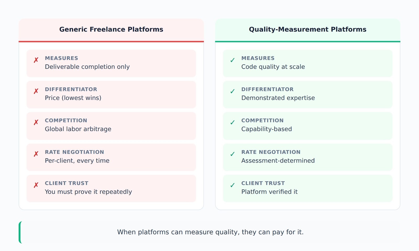 Generic freelance platforms can only measure deliverable completion: feature works or doesn't, deadline met or missed, client satisfied or not. This binary measurement forces developers into price competition because platforms lack the infrastructure to differentiate code quality beyond client acceptance.