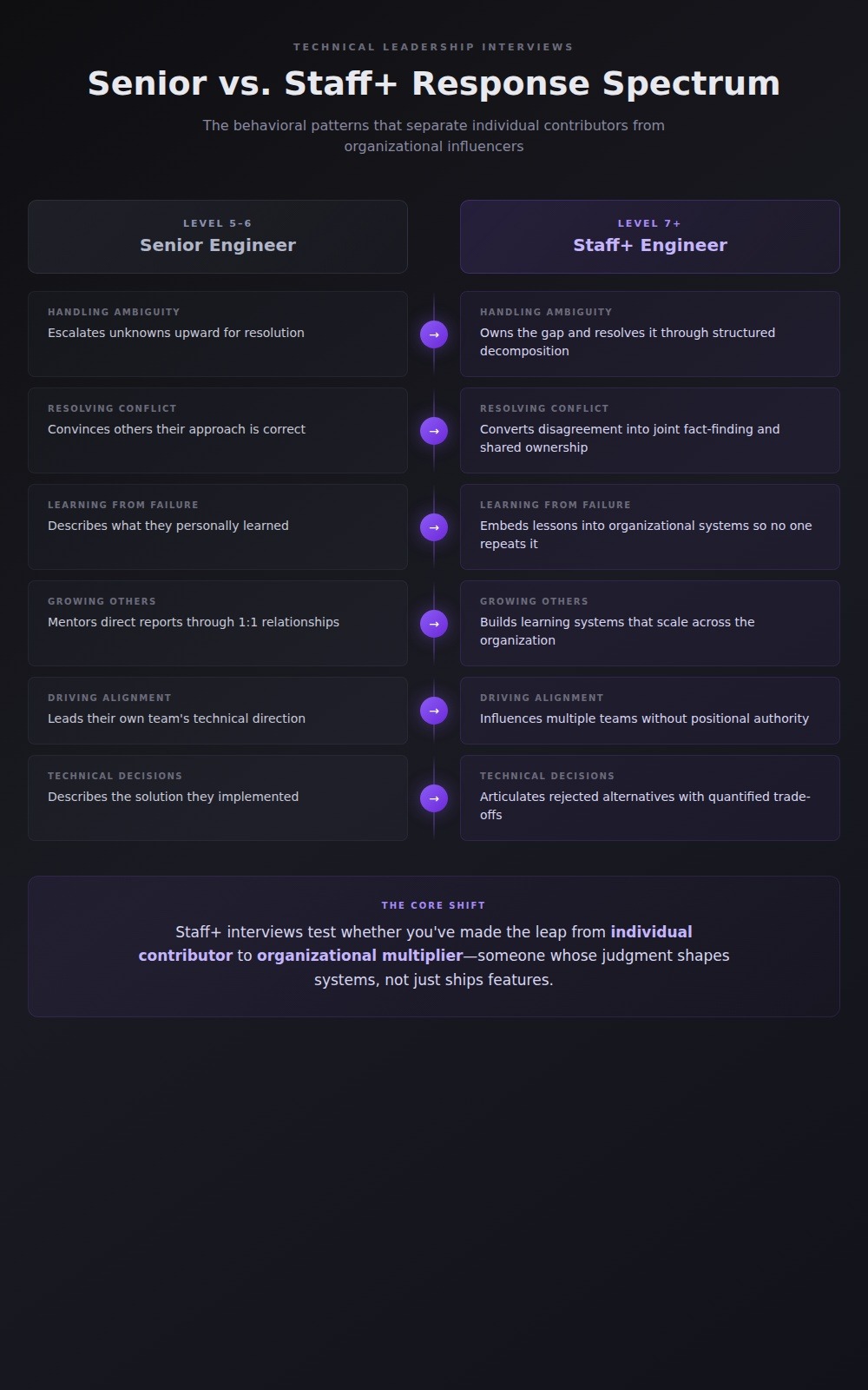 The contrast matters: a senior engineer escalates ambiguity upward; a Staff or Principal engineer owns the gap and resolves it through structured problem decomposition.