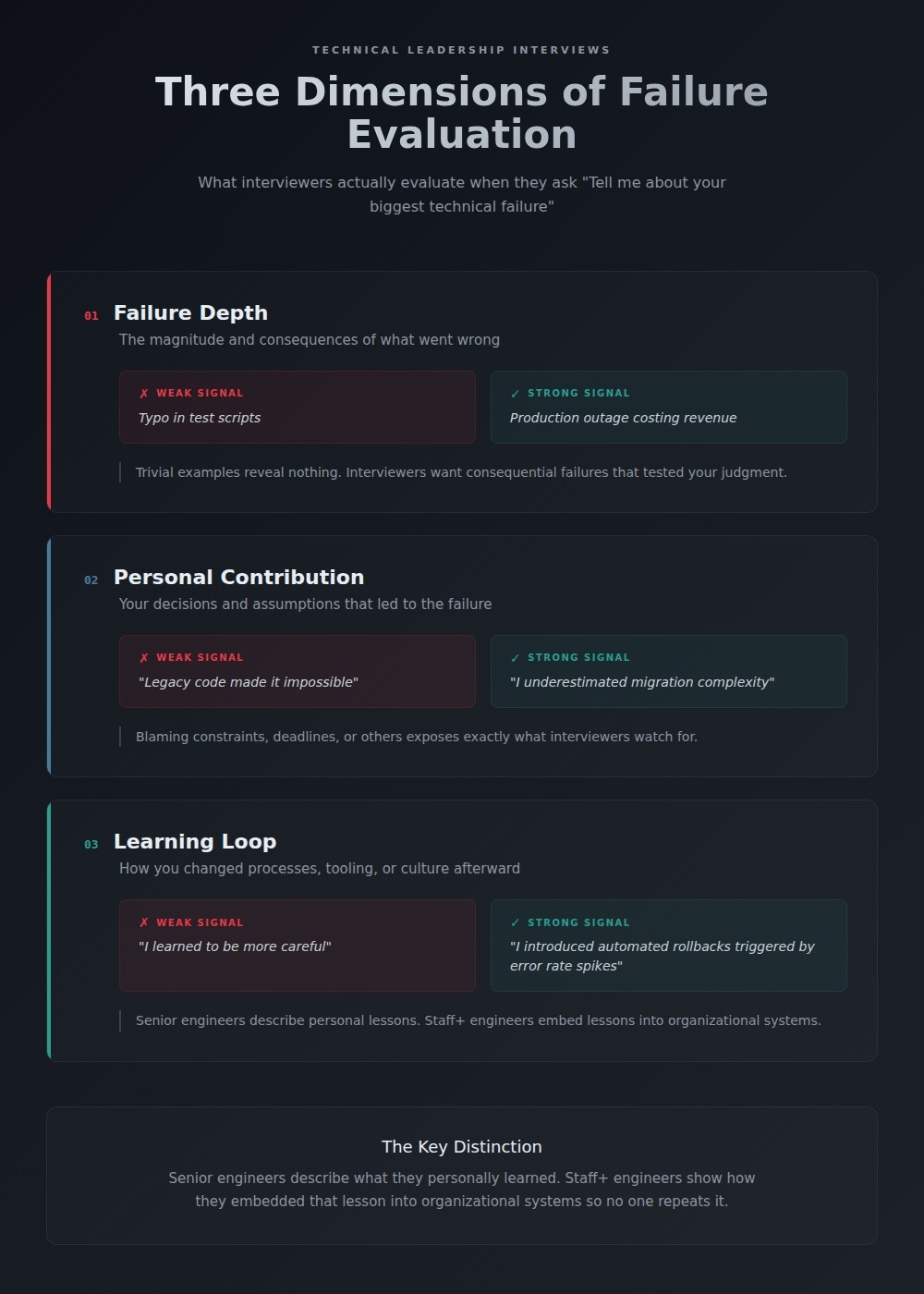 Interviewers use this to evaluate whether you own mistakes or deflect blame to circumstances, constraints, or others. They're listening for accountability, curiosity about root causes, and the ability to translate painful incidents into better engineering practice.