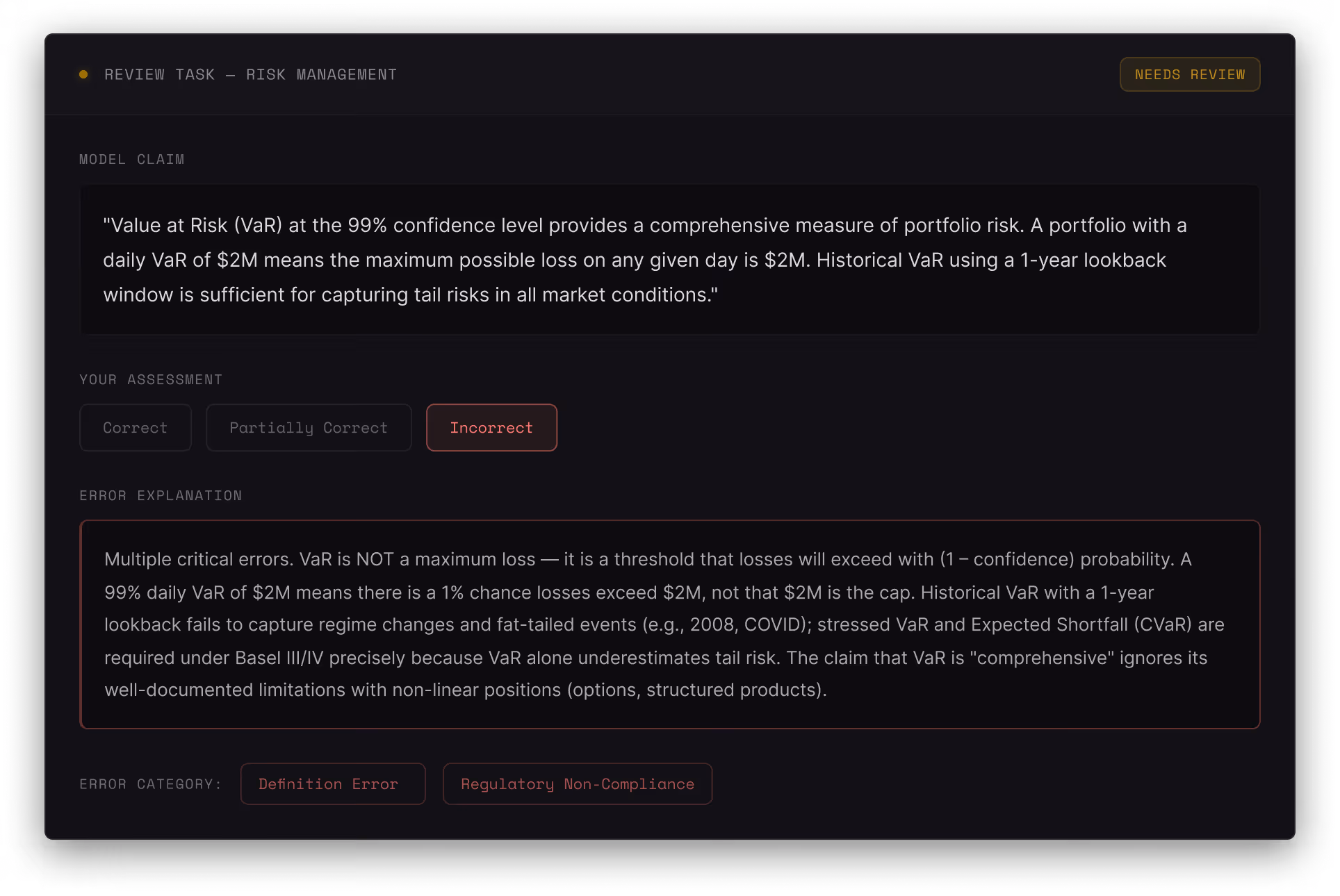 Evaluate model-generated financial analysis line by line. Identify hallucinated earnings figures, misapplied discount rates, and logical gaps in risk assessment frameworks.